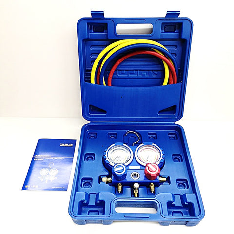 Aluminum Alloy Pressure Gauge With hand-crarry plastic case, CT-MC136-G-R12&R22, CE Approved, 3 pcs charging hoses